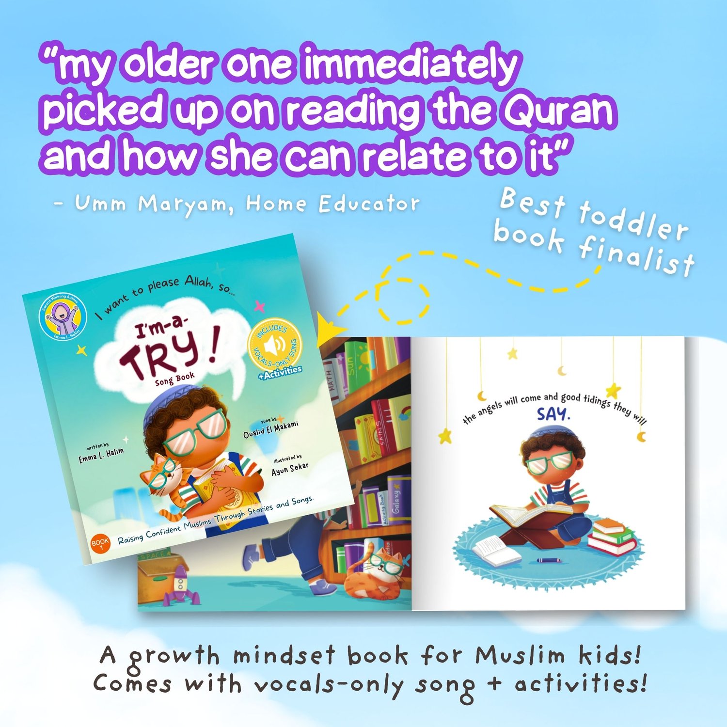 - Growth mindset, Muslim-style. Encourages kids to do good deeds inshaAllah. Comes with a vocals-only song by Oualid El Makami that kids LOVE singing on repeat.